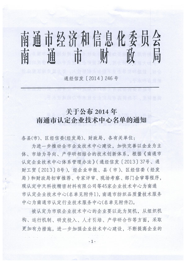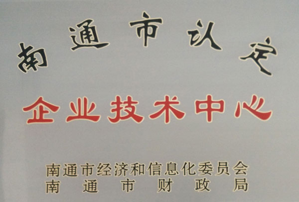 公司榮獲南通市認定企業技術中心